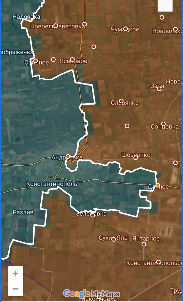 Части ДНР/РФ прорвавшись с северо востока, заняли центральную часть Андреевки и ведут бои за южную окраину. Таким образом, ВСУ в районе западнее Дачного находятся под угрозой окружения, причем в этой ситуации вероятность все таки довести угрозу до полной реализации у ДНР/РФ едва ли не максимальная за всю войну. По сути, им остаётся сомкнуться в восточной части Константинополя, пройдя с обеих сторон считанные километры.