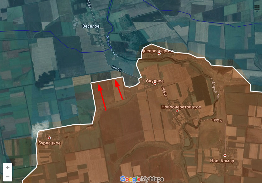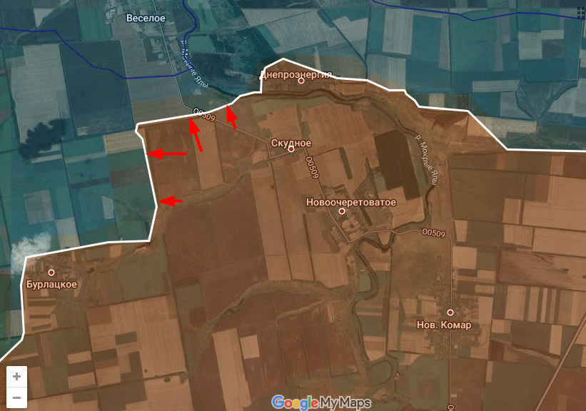 На участке между Бурлацким и Скудным части Днр/Рф продавили украинскую оборону на север в общем направлении Веселого.