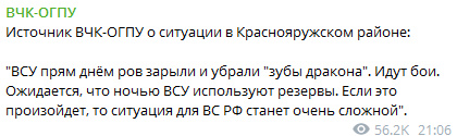 На красноармейском участке Всу, глубоко вклинившись, прорвали оборону Днр/Рф в районе н.п. Шевченко и обошли его с юга. Также отмечаются ожесточенные бои в районе Котлино и Успеновки, но без видимых успехов сторон.