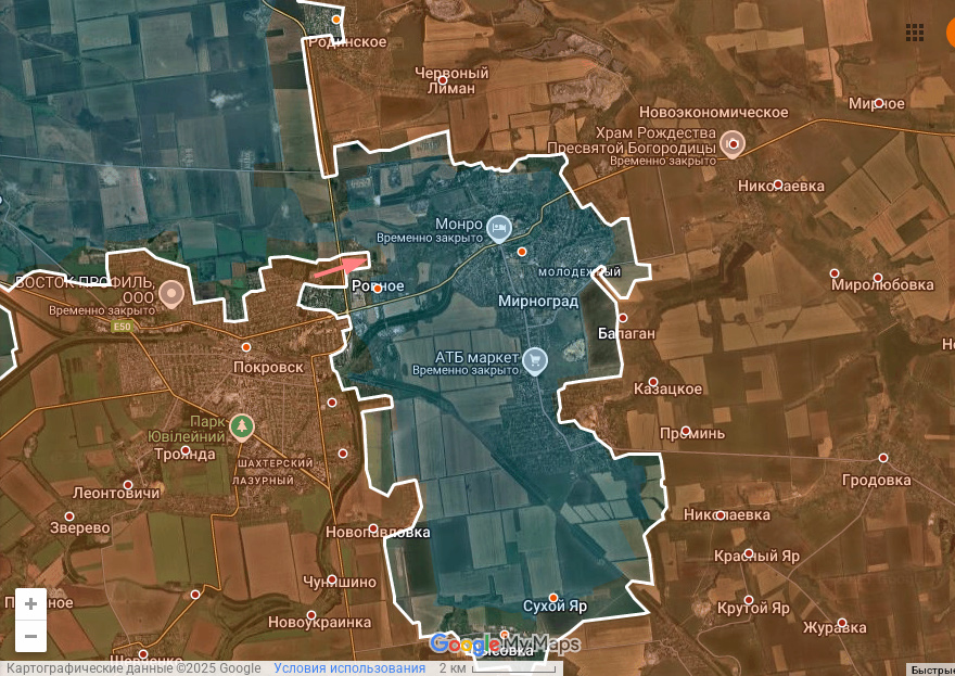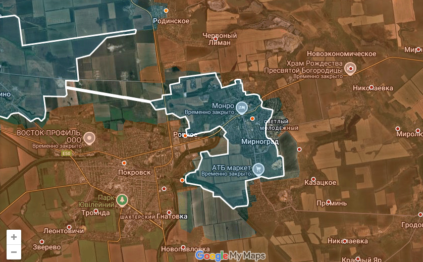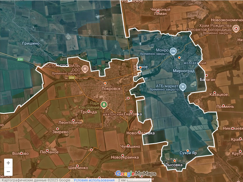 Цитата: Администратор от 05.11.2025, 20:59Красноармейск/Покровск практически полностью контролируется Днр/Рф, более того, от его северо-восточной окраины они продвинулись на восток, в сторону Димитрово/Мирнограда. Т е коридор для выхода остался в пару километров шириной.