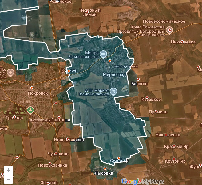 Всу практически выбиты из Красноармейска/Покровска, однако фактического окружения как не было, так и нет. Можно говорить о контроле дронами узкого горлышка северо-восточнее Красноармейска, это наверняка осложнит ситуацию для гарнизона Димитрово/Мирнограда, но при наличии запасов держаться укрармия может долго.