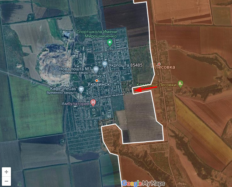 В районе Украинска части Днр/Рф, ранее занявшие юго-восточную часть города, смогли подойди к нему с востока по дороге на Лесовку.