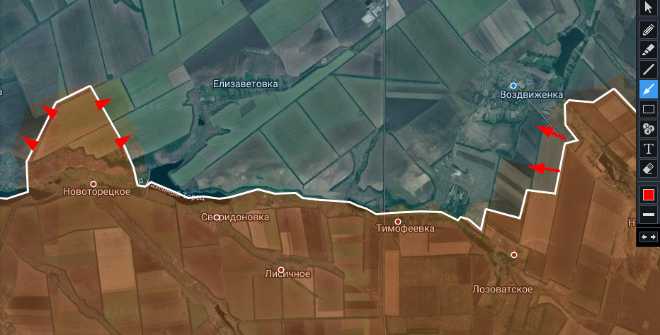 На северном фланге красноармейского выступа части Днр/Рф пытаются атаковать в направлении Воздвиженки и севернее Новоторецкого. Там расширилась зона боев, но закрепить успех пока не удается.