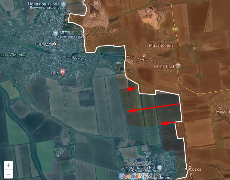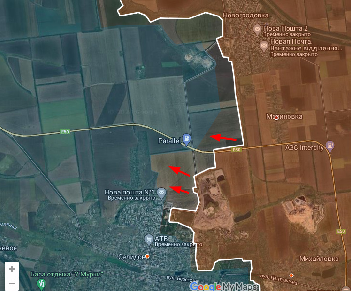 В Селидово Днр/Рф потеряли юго-восточную часть города, но, как и утверждают украинские источники, существенно активизировались бои между Селидово и Украинском.