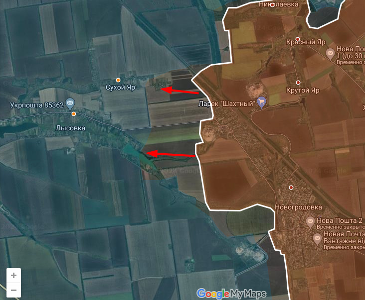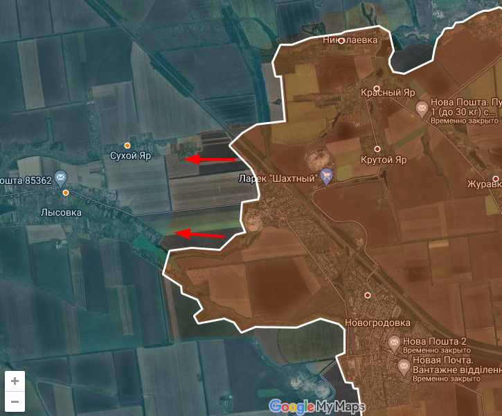 Здесь продолжаются попытки продвижения Днр/Рф в направлении Сухого Яра и Лысовки с общим направлением на Красноармейск. Но закрепления на достигнутых рубежах частям Днр/Рф пока не удается.