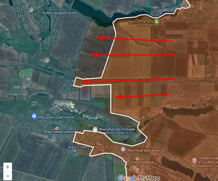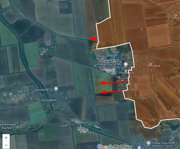 Однако самый серьезный провал украинской обороны произошел между северо-западной окраиной Красногоровки и Максимильяновкой. После прорыва частей Днр/Рф на северо-запад от Красногоровки украинские части в этом районе оказались в полуокружении.