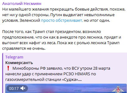 Загруженные файлы:Цитата: Администратор от 28.03.2025, 22:16Под руководством опытного режиссера и средний актер сыграет на овации. Зеля бьет в самую больную мозоль кремляди, предлагая, по сути, сепаратные переговоры мимо Москвы. А Кремль так тщательно зачищал политику от любой самодеятельности...Понятно, что на переговоры с Ук сейчас никто не рискнет. Весь этот месседж запущен с единственной целью - просто позлить Москву, вывести её из равновесия, авось что то наперекор Трампу ляпнут...