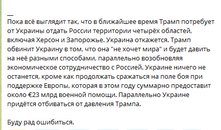 Итог: Вероятность перемирия есть, но итоговые условия могут отличаться от текущих. Решающими станут встреча в Лондоне и визит Уиткоффа в Москву.