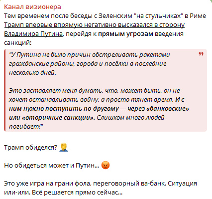 Цитата: Администратор от 28.04.2025, 22:08Похоже, то, о чем мечтал Киев, разозлить Трампа на Москву, Кремль успешно делает собственными усилиями. После переговоров с Уиткоффом Лавров лично дезавуирует все положительные итоги.