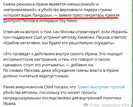 Цитата: Администратор от 20.06.2025, 10:49Истерика Кремля вполне объяснима, в таком варианте развития событий они следующие на ликвидацию.