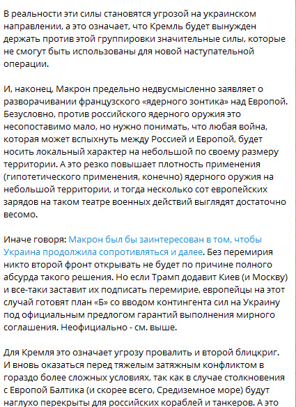 Т е армия Рф втянется в бои где то на западе, завязнет там, а Всу, смяв символическое прикрытие, бодро промарширует на восток и север. Тут уже не о Донбассе и Крыме, а о Кубани и Москве пойдет речь в таких условиях. Можно, конечно, рассчитывать на маразм счастливого дедушки, но строить на этом основании стратегические планы несерьезно.