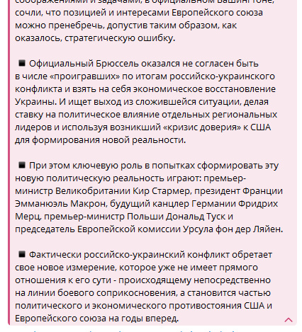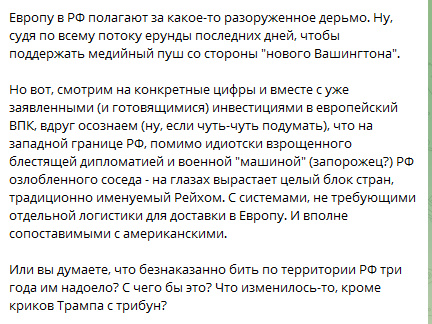 Именно по этой причине у Европы развязаны руки в военном смысле. Воевать с ней просто нечем. Какой бы договор не был подписан в теории с Ук, Киев на него наплюет при первом же удобном случае. Потому армию все равно придется держать в относительной готовности недалеко от линии разграничения. Ну не Трамп же пришлет экспедицонный корпус воевать за Россию.