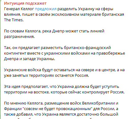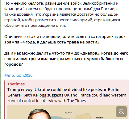 Генерал Кит Келлог, ведущая фигура в усилиях США по прекращению трехлетней войны, предположил, что британские и французские войска могли бы принять зоны контроля на западе страны как часть «силы успокоения», с российской армией на оккупированном востоке. Между ними будут украинские силы и демилитаризованная зона.