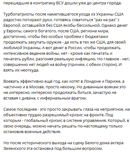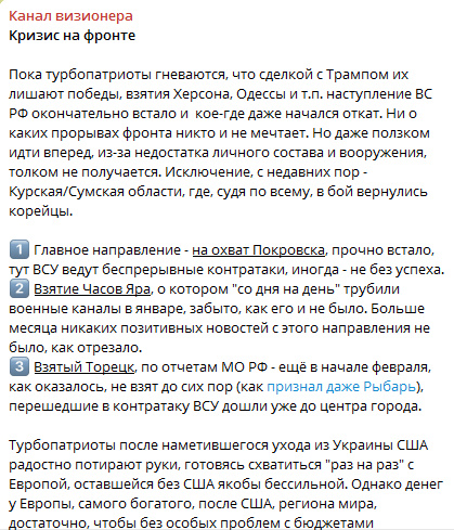 Цитата: Администратор от 03.03.2025, 13:36Сильно напоминает вброс для успокоения ура-патриотов. Хотя ожесточение войны процесс вполне ожидаемый, какие то резкие подвижки маловероятны. Объективно да, ситуация на фронте опять застряла, воевать особо некем, да и с деньгами тяжелее у Рф, ставка на вынос тыла напрашивается. Но как будет реализовано, другой вопрос...