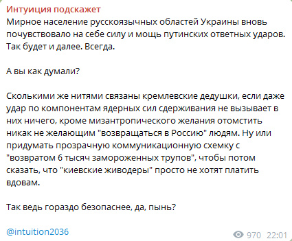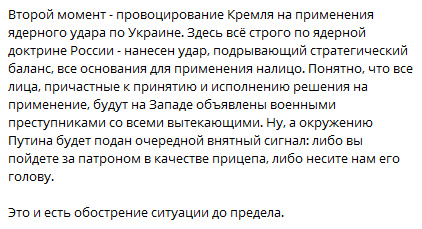 Опять же возвращаемся к прошлому пункту. Россия уже ведёт войну с максимальным напряжением сил и постоянно обстреливает Украину, в том числе с помощью уничтоженных вчера самолётов, а в ночь на 1 июня был рекорд по количеству запусков БПЛА, почти 500 Шахидов и имитаторов. Нельзя обстрелять Украину больше, чем и так обстреливается в рамках войны ежедневно, можно лишь обычный удар выдать за «удар возмездия», чтобы успокоить глубинный народ.