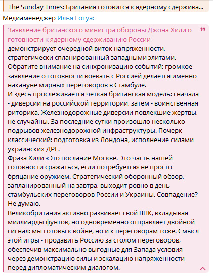 Цитата: Администратор от 02.06.2025, 20:37И еще одно замечание о вчерашнем налете. Если предположить, что за ним может проглядывать интерес британских спецслужб, да и уровень, в общем-то, достаточно высокий у всей операции, то перед нами (в том числе) стресс-тест будущих провокаций.