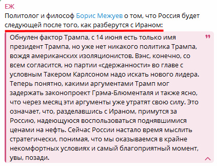 Цитата: Администратор от 08.06.2025, 10:05Мнение: Артжокей: К моему удивлению ещё не все поняли на 4-й год СВО, что Россия ведёт войну с полным напряжением сил и воевать сильнее в принципе не может.