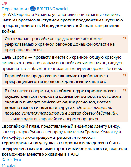 Украина (Зеленский): Рискует получить ультимативное предложение, вынуждающее либо принять потерю территории, либо отказаться. Реакции украинских властей на публикацию пока нет.