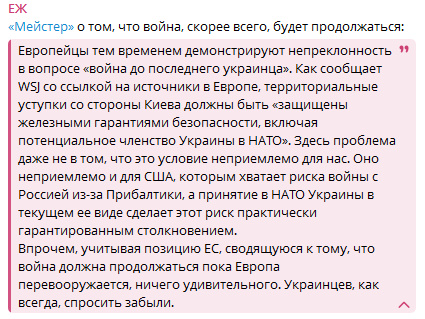 Цитата: Администратор от 19.07.2025, 23:59Это то, что я все время повторяю: не будет Европа мириться с РФ, задачу на унасекомливание кремляди никто не отменял: