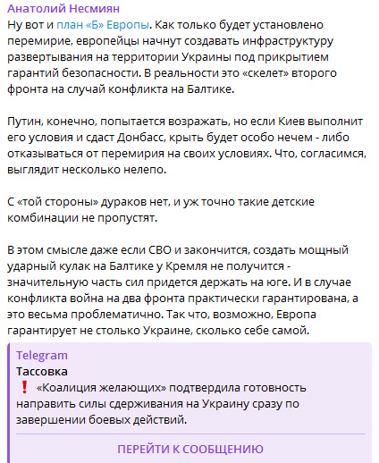 «Военная хроника» (https://t.me/Warhronika/9706) о том, как Россия может ответить на размещение европейских войск на Украине: