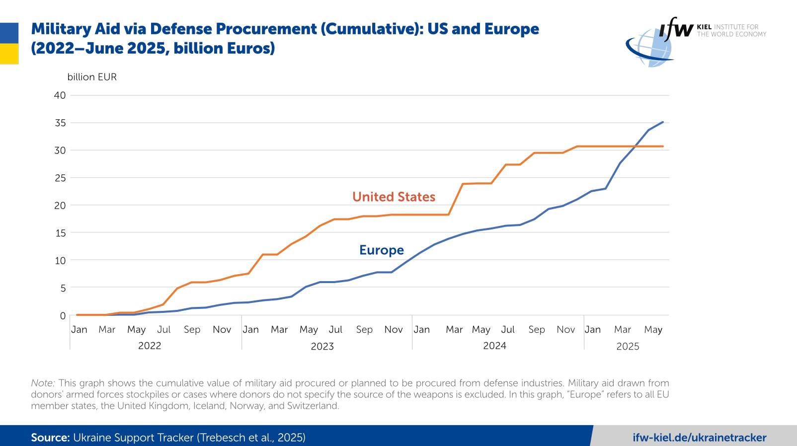 В период с февраля 2022 года по июнь 2025 года Европа выделила Украине не менее 35,1 миллиардов евро (41,1 миллиард долларов) на военно-промышленное производство для Украины, что на 5,15 миллиардов долларов больше, чем США выделили за тот же период.