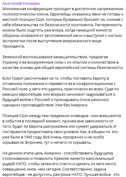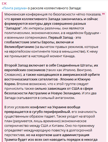 Цитата: Администратор от 15.02.2025, 20:18Дипломатический источник «Незыгаря» (https://t.me/russicaRU/61425) считает, что «инициативы Трампа быстро наскочили на интересы ЕС и Китая, а Украина воспользовалась ситуацией и призвала выстраивать европейскую политику без Трампа. Американская администрация может утратить темп и увязнуть в конфликтах со своими союзниками. Все это серьезно сглаживает первоначальный эффект, Белый дом находится в противоречивых размышлениях, а у России появился шанс не встраиваться в переговорный вектор Трампа, а предлагать собственную повестку».