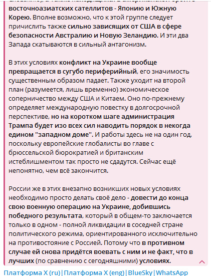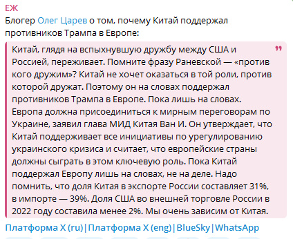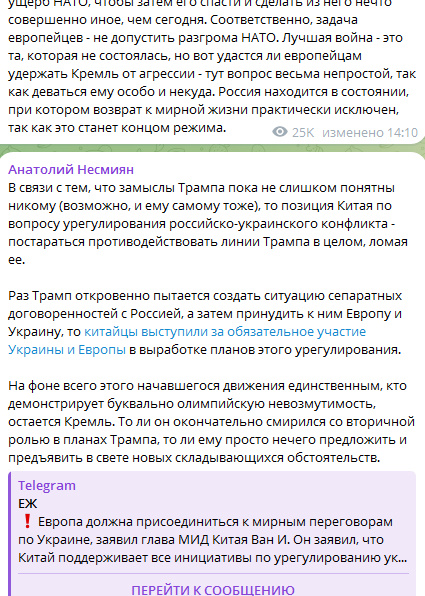 Дипломатический источник «Незыгаря» (https://t.me/russicaRU/61425) считает, что «инициативы Трампа быстро наскочили на интересы ЕС и Китая, а Украина воспользовалась ситуацией и призвала выстраивать европейскую политику без Трампа. Американская администрация может утратить темп и увязнуть в конфликтах со своими союзниками. Все это серьезно сглаживает первоначальный эффект, Белый дом находится в противоречивых размышлениях, а у России появился шанс не встраиваться в переговорный вектор Трампа, а предлагать собственную повестку».