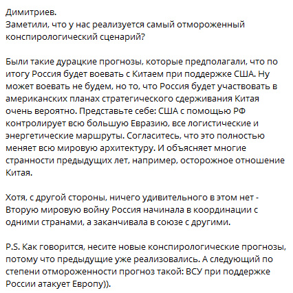 В моей версии союзники/противники, не желая допустить перехода Рф на другую сторону, инициируют распад постСССР на кучку враждующих между собой бандформирований типа Длнр и устроят свои разборки на этой территории, используя банды как прокси.